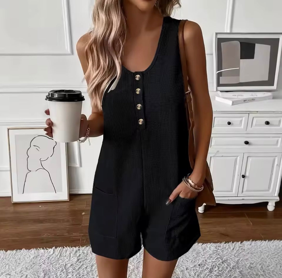 Cette combinaison sans manches dispose d’une coupe fluide favorisant l’aisance de mouvement. Le boutonnage sur le devant constitue un élément de conception, tandis que les poches ajoutent une fonction pratique. Sa ligne simple permet de l’intégrer à différentes tenues du quotidien, en intérieur comme en extérieur.