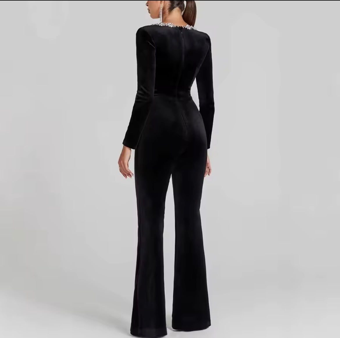 Combinaison femme élégante – Velours brillant, taille haute et jambes cloche